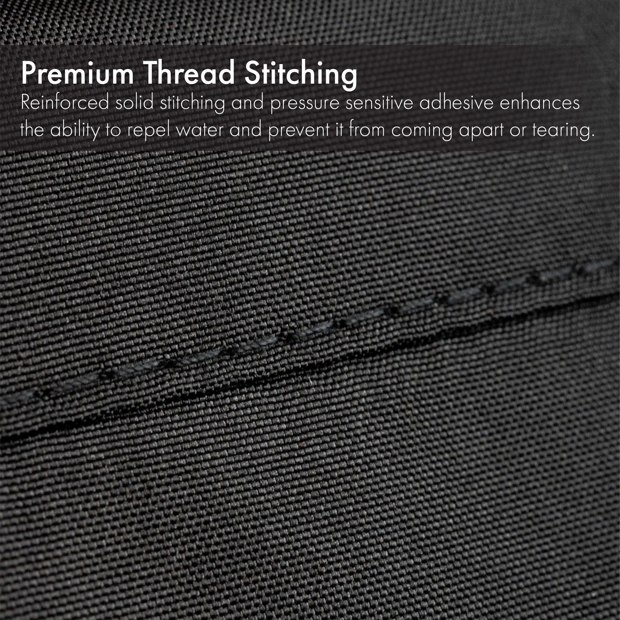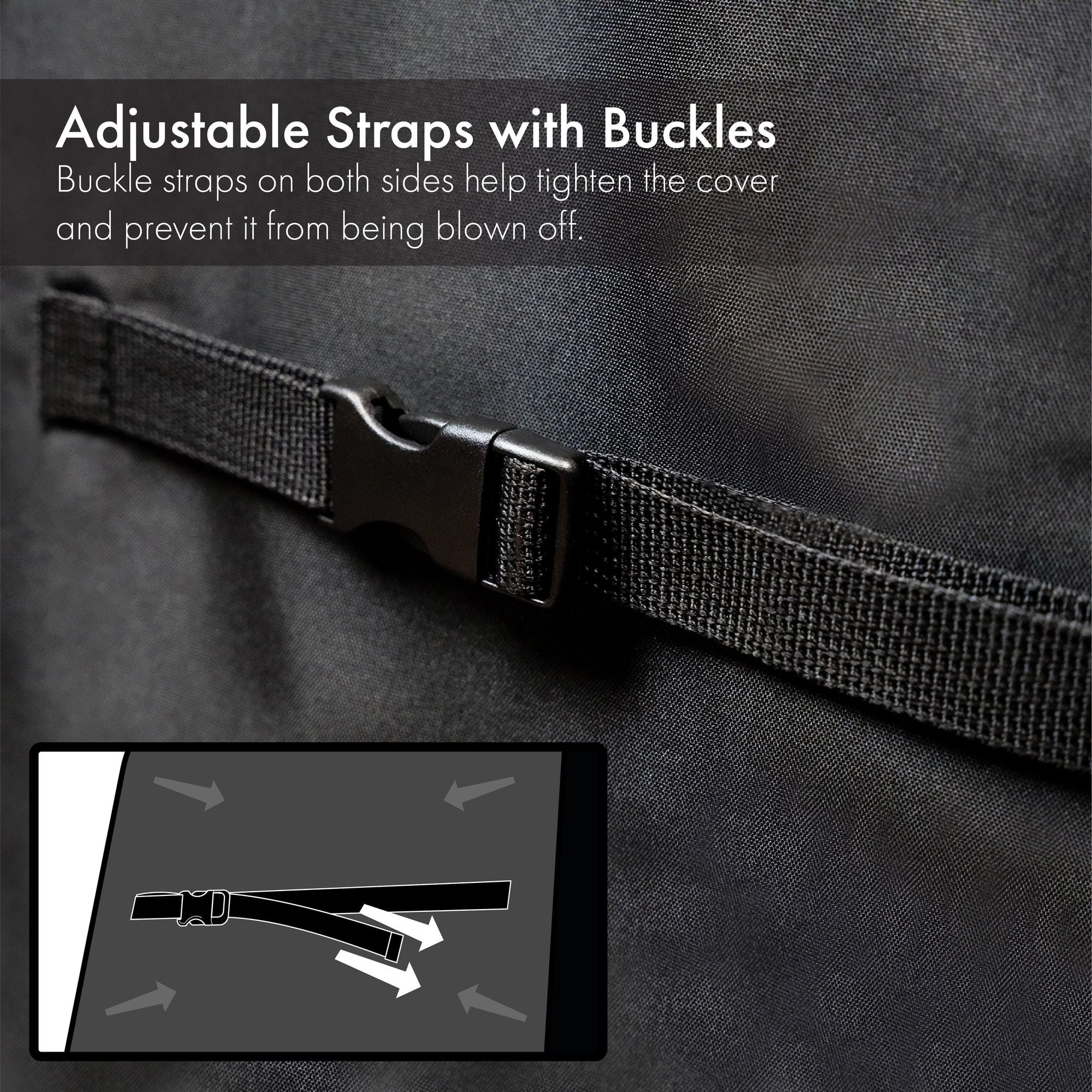 from coming apart or tearing. easy to use. handles on each side of the cover allows for easy installation and removal of the cover. adjustable straps on the bottom of both sides help tighten the cover and prevent it from being blown off and are fastened with sturdy side release buckles.