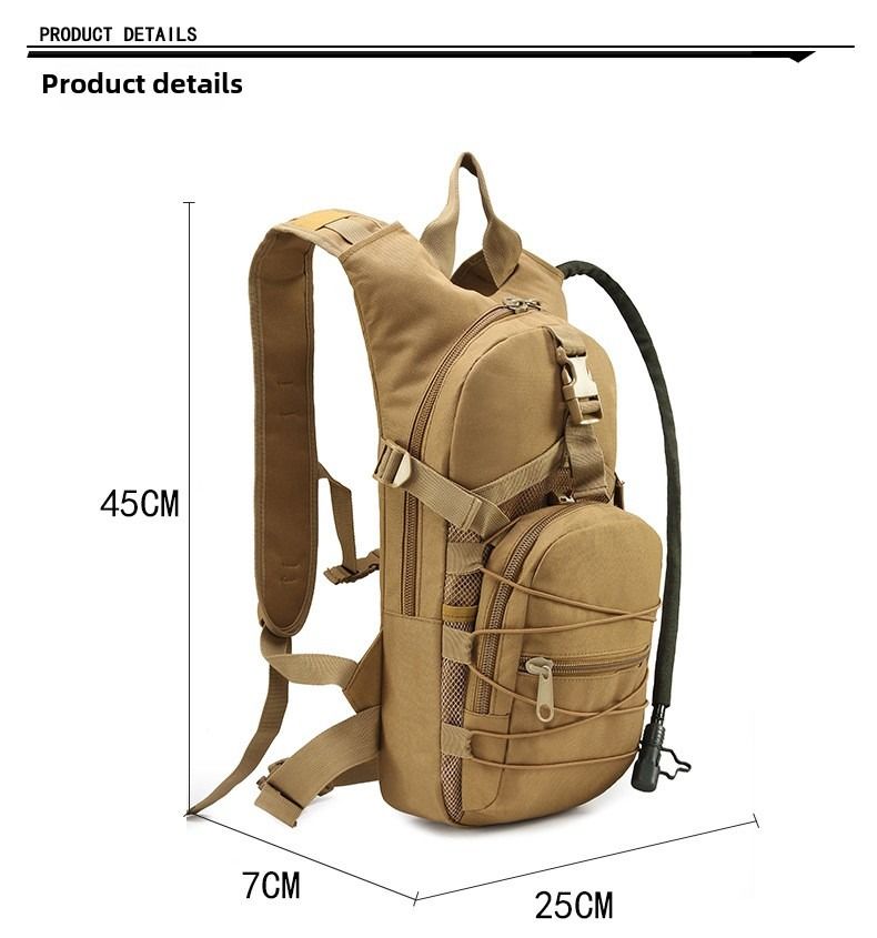 Designed for hiking, trail riding and running sports, this men's outdoor tactical water bag backpack is compatible with water bag system for easy hydration at any time. Made of lightweight, waterproof and wear-resistant material, the breathable back system ensures comfort and stability. Multi-functional storage design, can store the necessary equipment, to meet the needs of long-distance sports. Adjustable shoulder straps fit your body to minimize shaking and enhance the sports experience. Suitable for cycling, hiking, running and outdoor adventure, it is the ideal hydration equipment for sports enthusiasts.